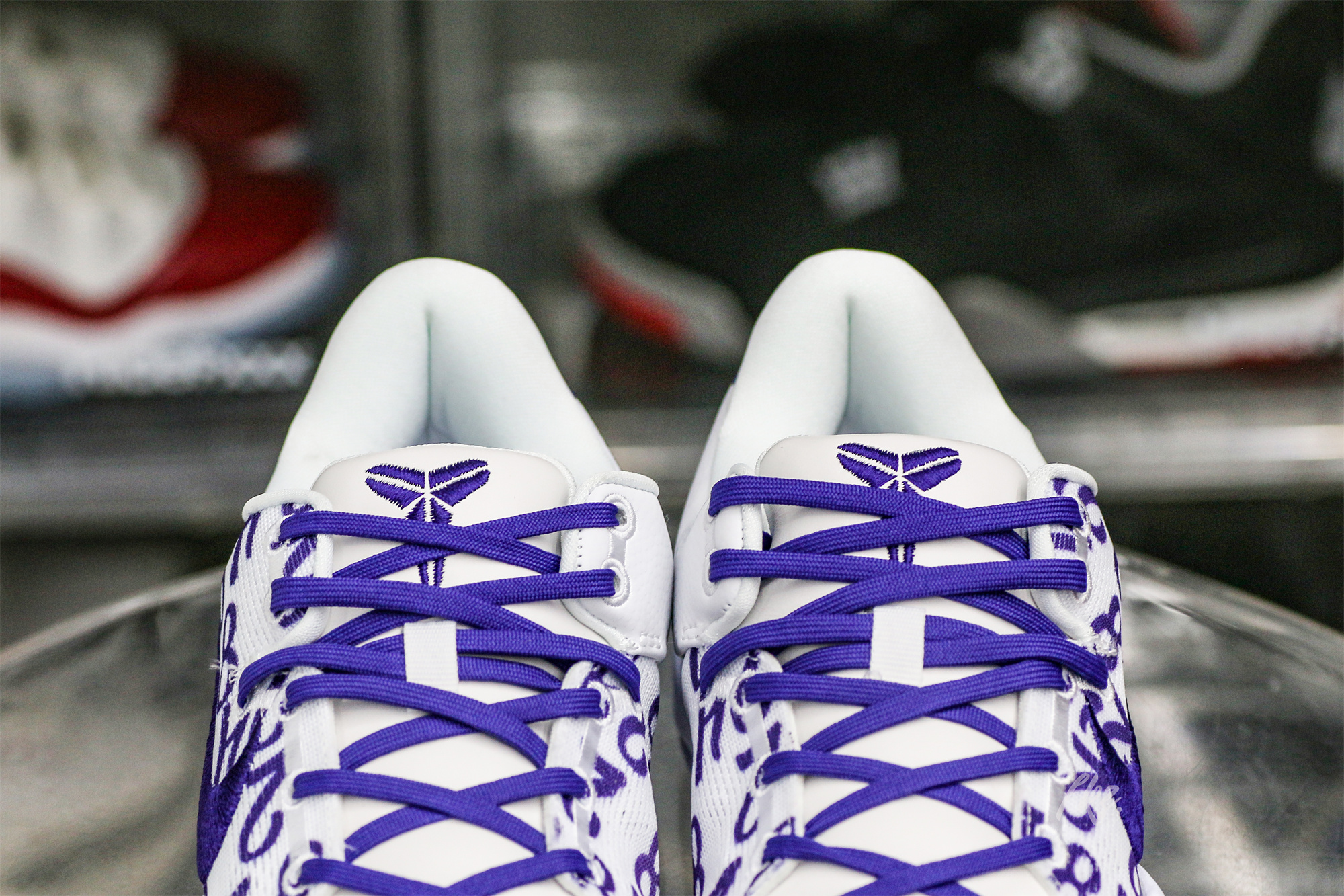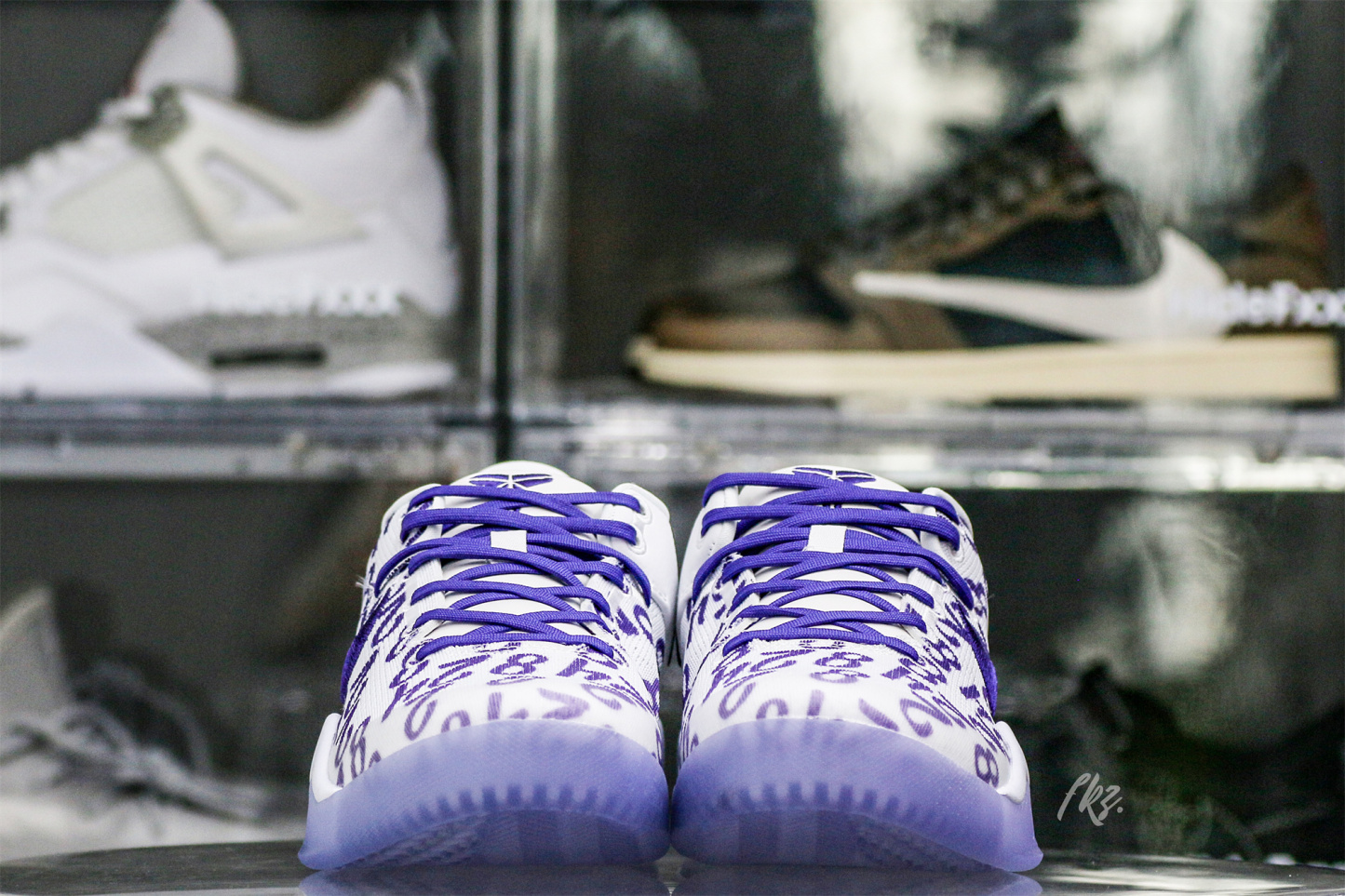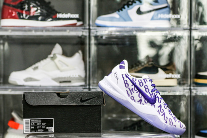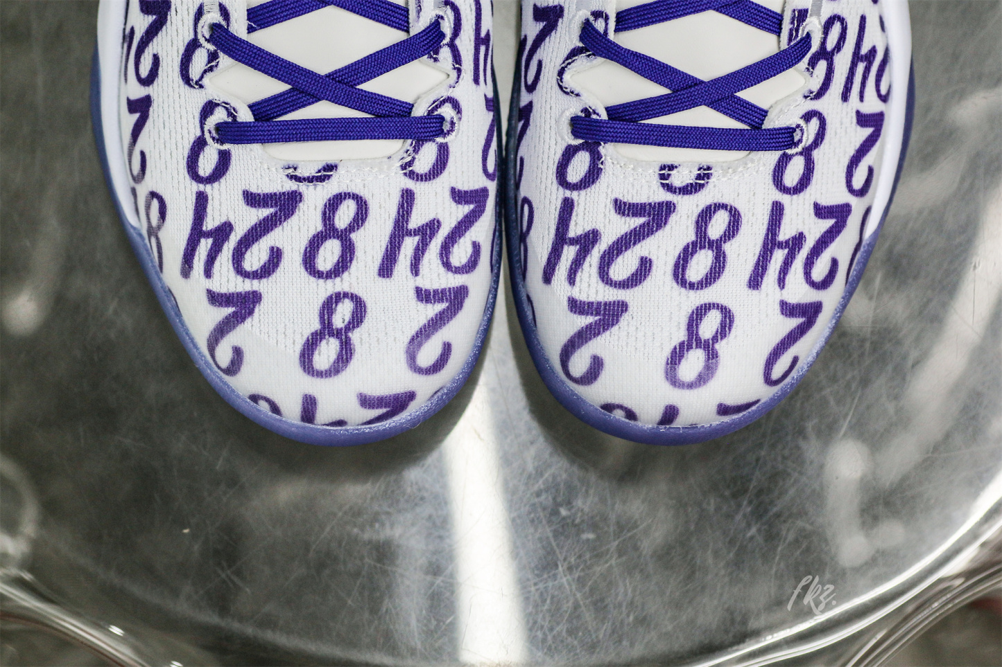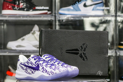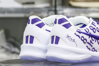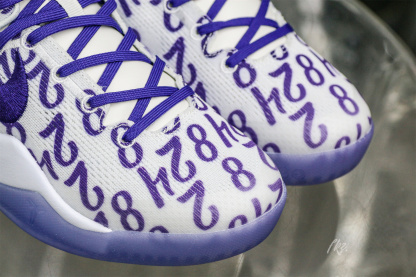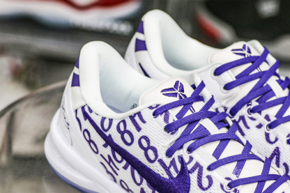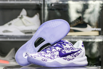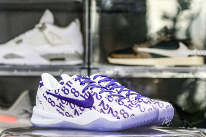 Kobe Bryant's jersey numbers '8' and '24' are monogramed on the engineered mesh upper of the Nike Kobe 8 Protro 'Court Purple,' secured with purple laces and a soft padded collar. A drop-in React foam midsole keeps every step lightweight, while a purpled-hued rubber outsole is split by a shank plate to keep the midfoot in place.