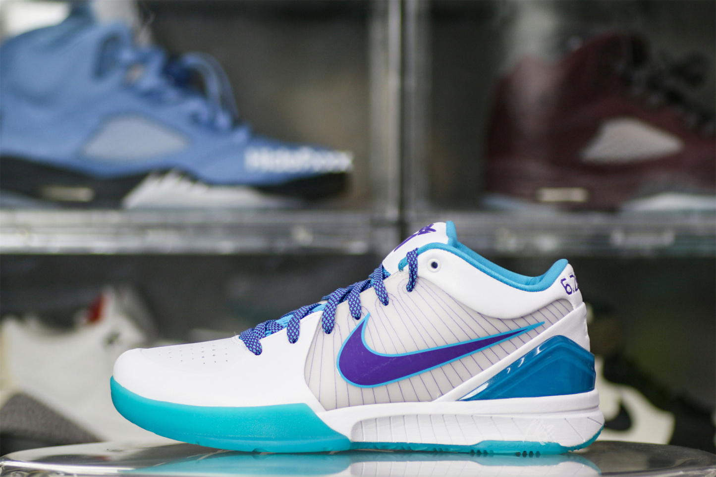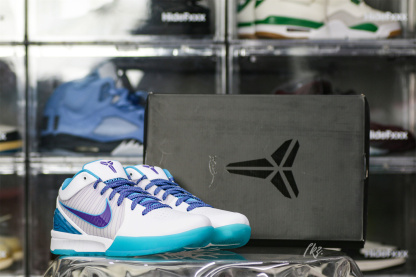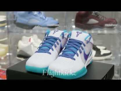 Look back at the 1996 NBA Draft and cop the Kobe 4 Protro Draft Day Hornets. This Kobe 4 comes with a white upper with blue and purple accents, purple Nike "Swoosh", white midsole, and blue sole. These sneakers released in February 2019 and retailed for $175.