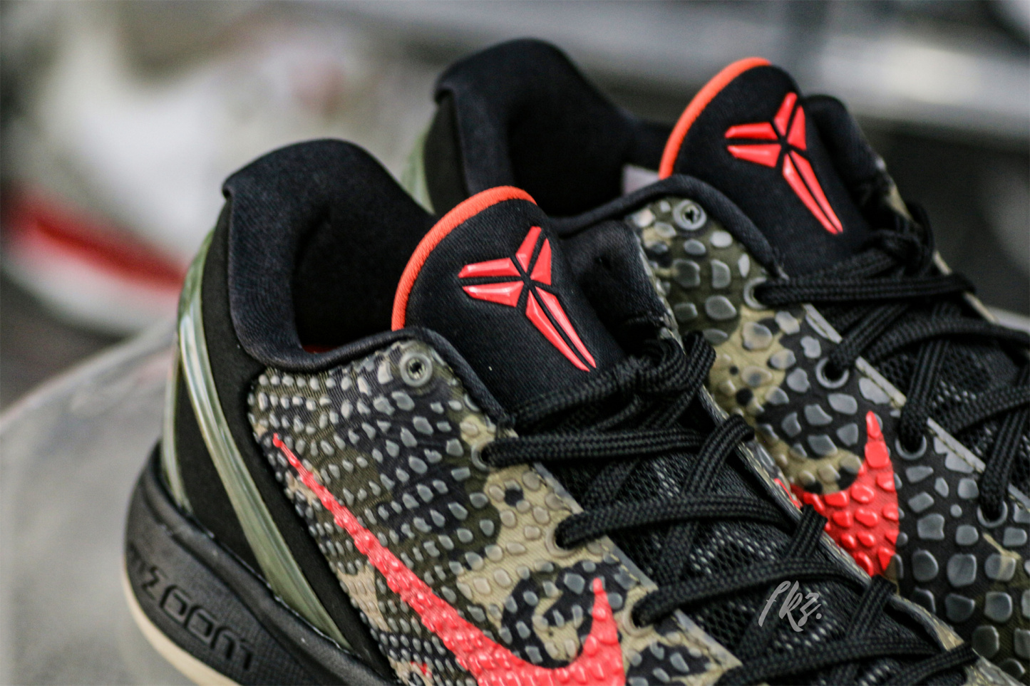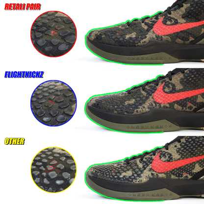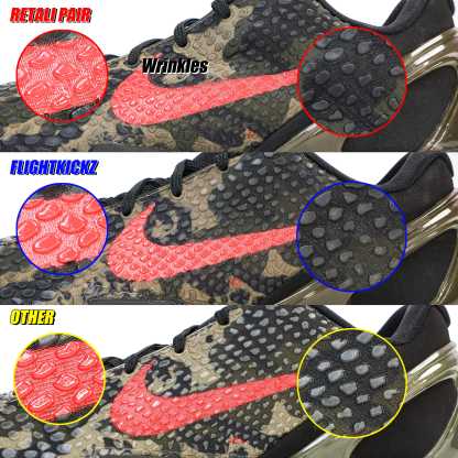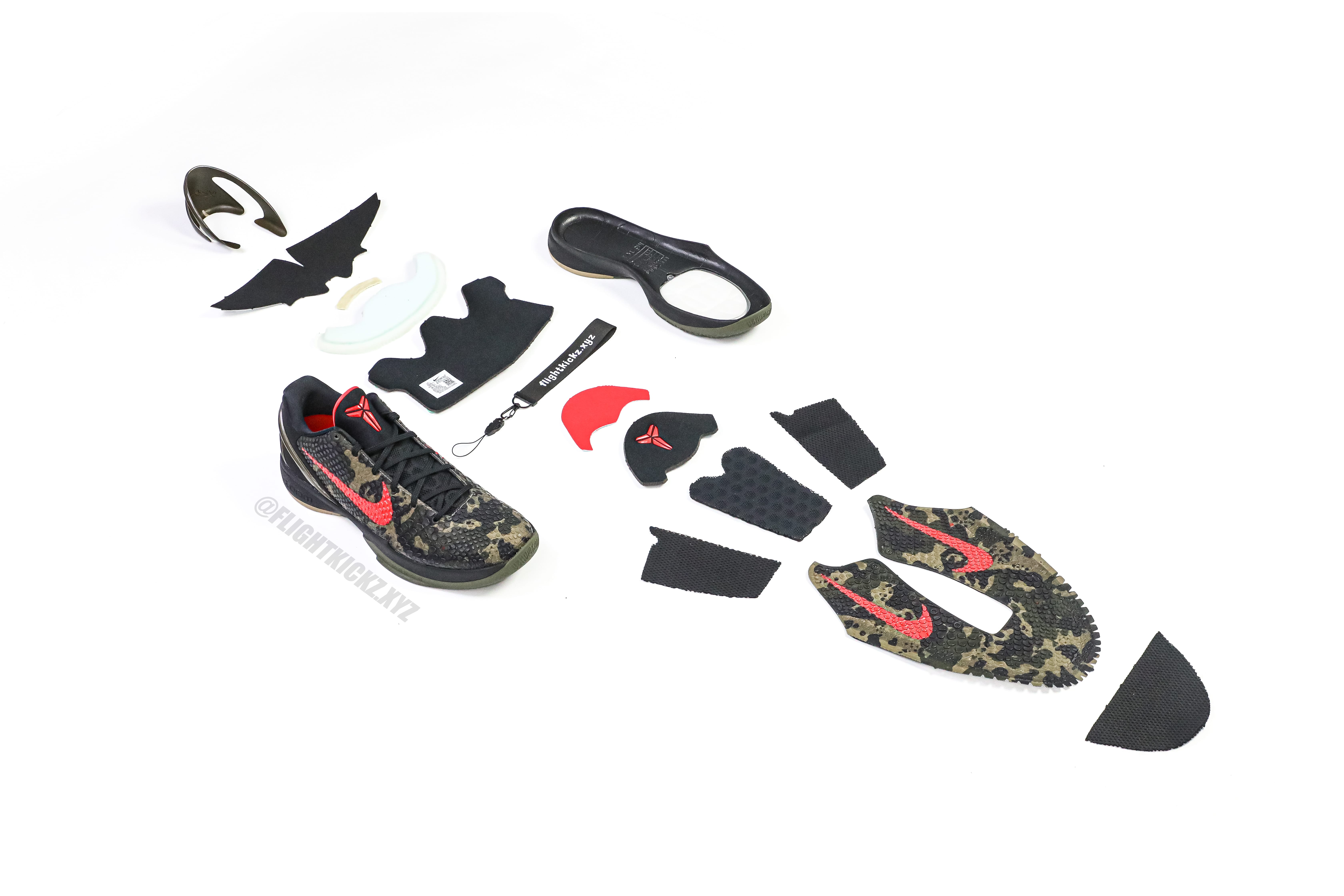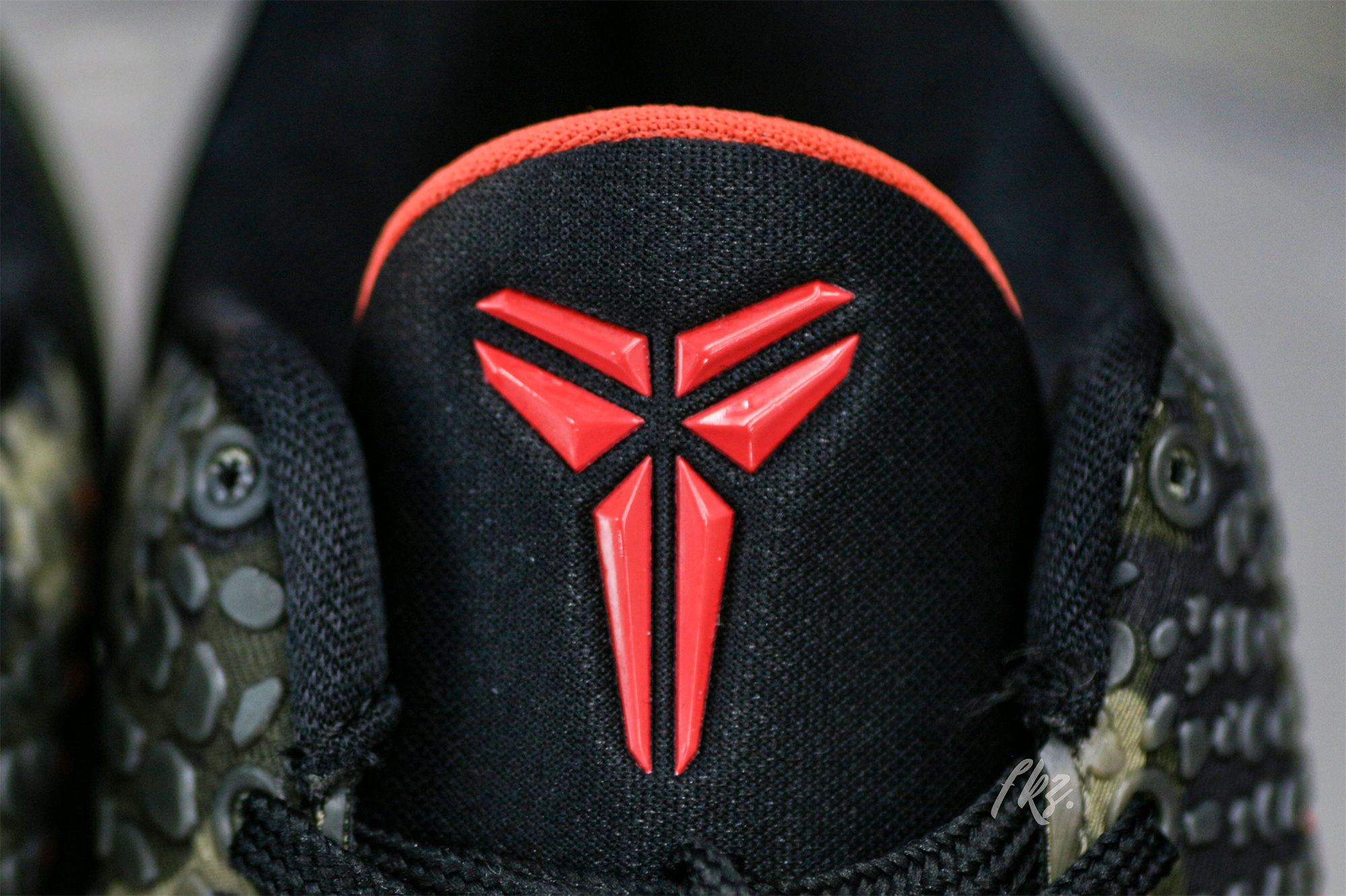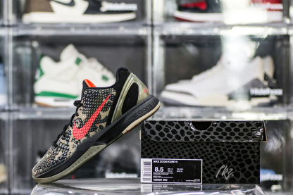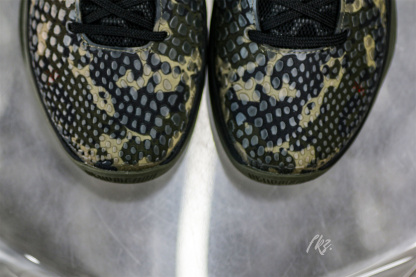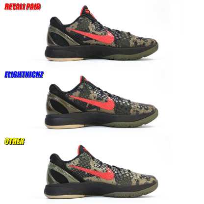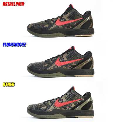 The Zoom Kobe 6 'Camo' features a utilitarian colorway that works a camo pattern into its signature polyurethane snakeskin-textured upper. The tongue and Swoosh branding add contrasting crimson, while the heel counter maintains the otherwise-subdued look. The black midsole houses Zoom Air in the forefoot and heel.