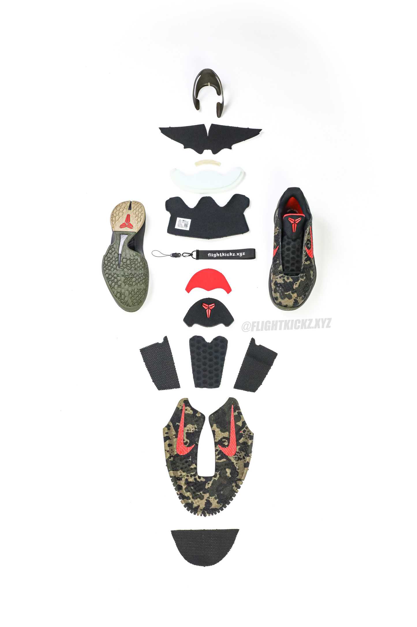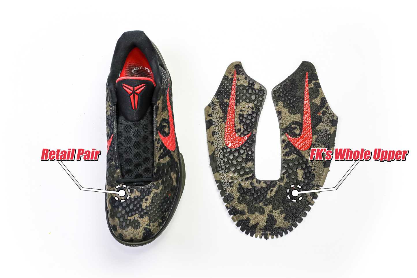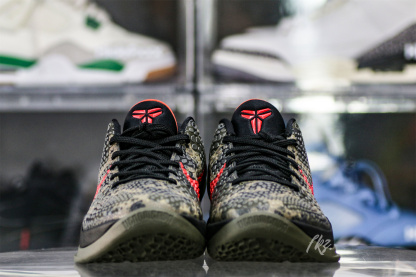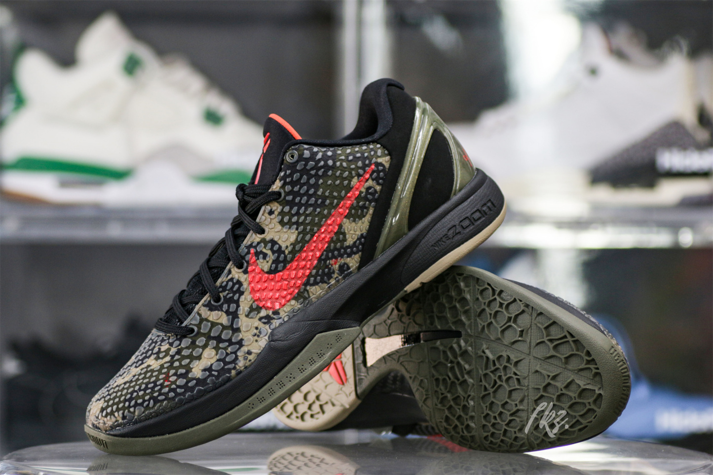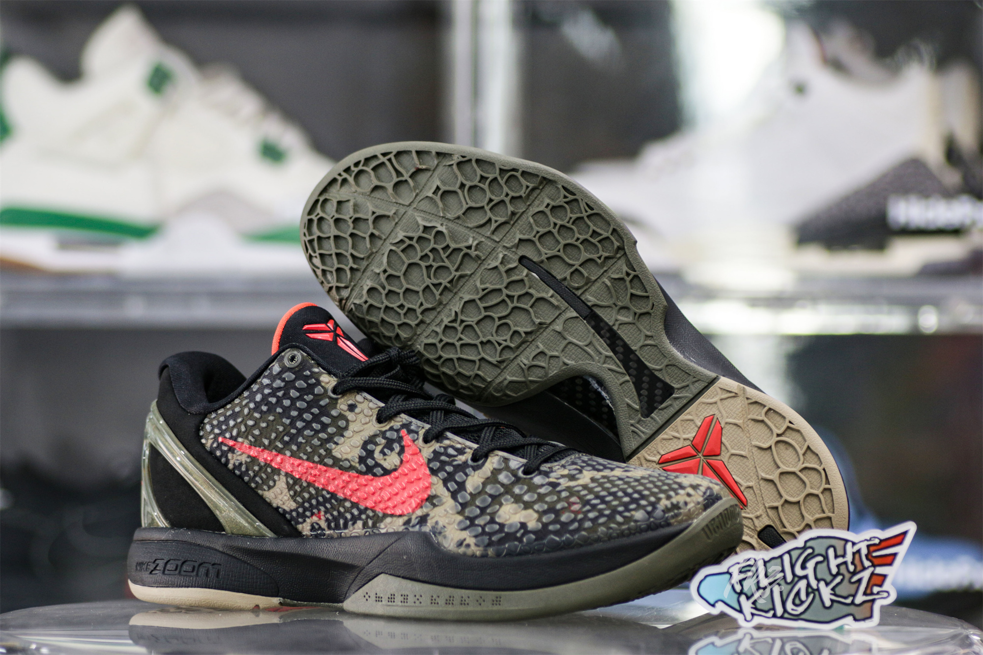The Zoom Kobe 6 'Camo' features a utilitarian colorway that works a camo pattern into its signature polyurethane snakeskin-textured upper. The tongue and Swoosh branding add contrasting crimson, while the heel counter maintains the otherwise-subdued look. The black midsole houses Zoom Air in the forefoot and heel.