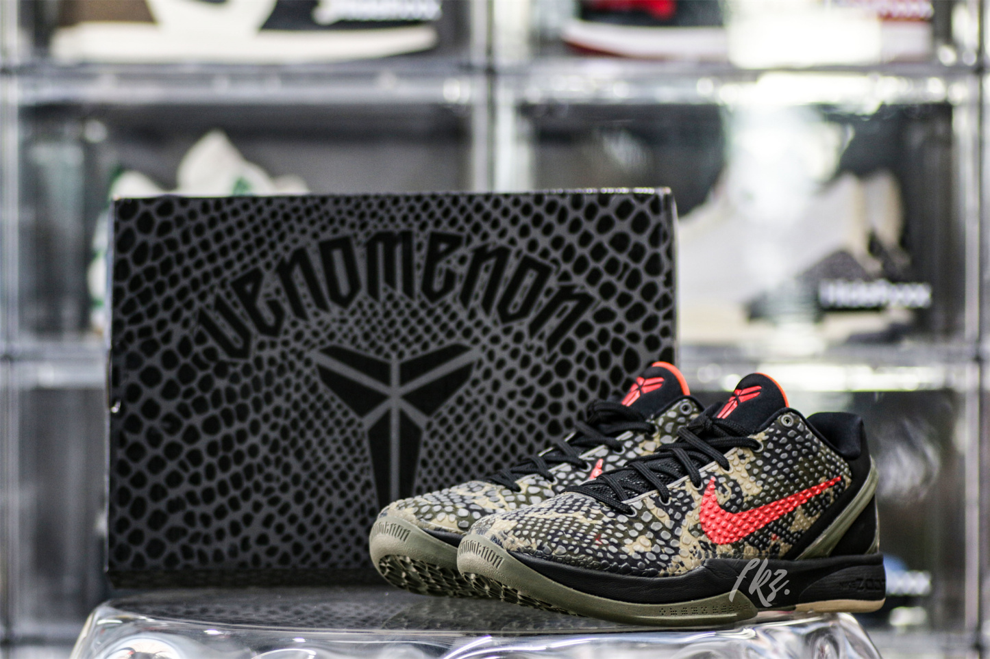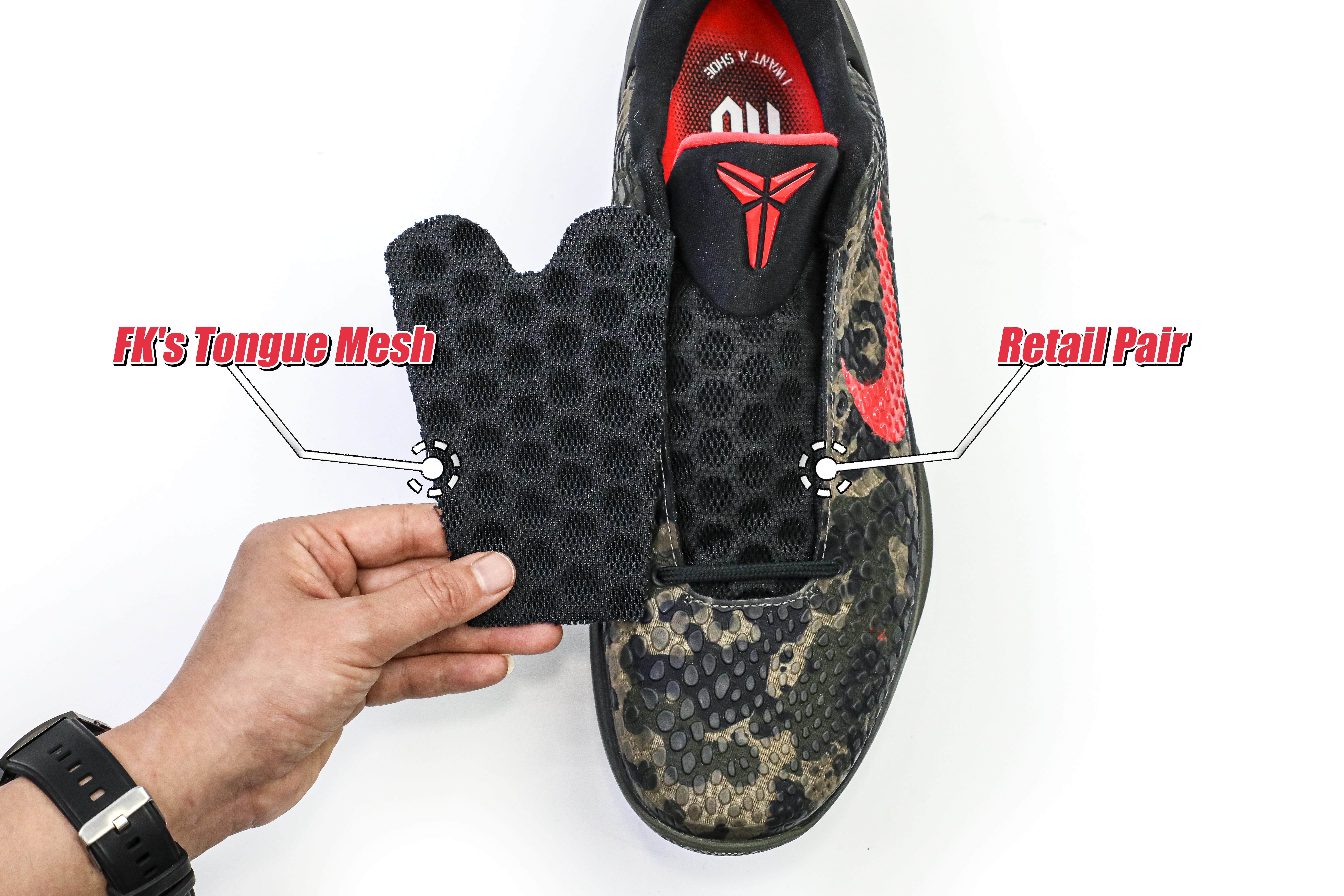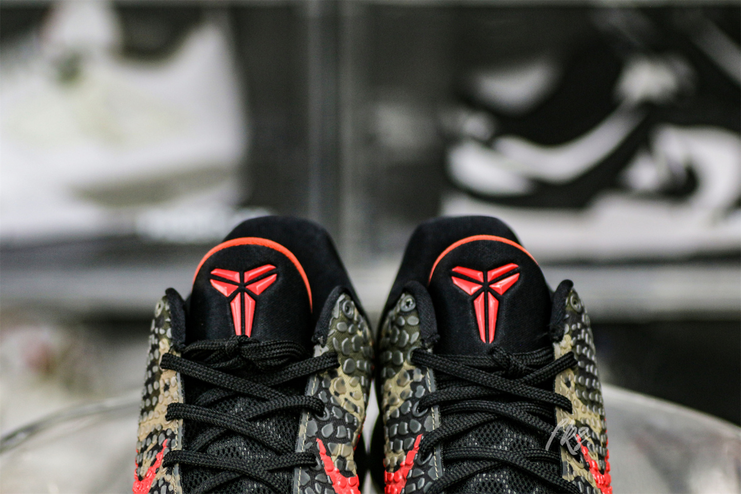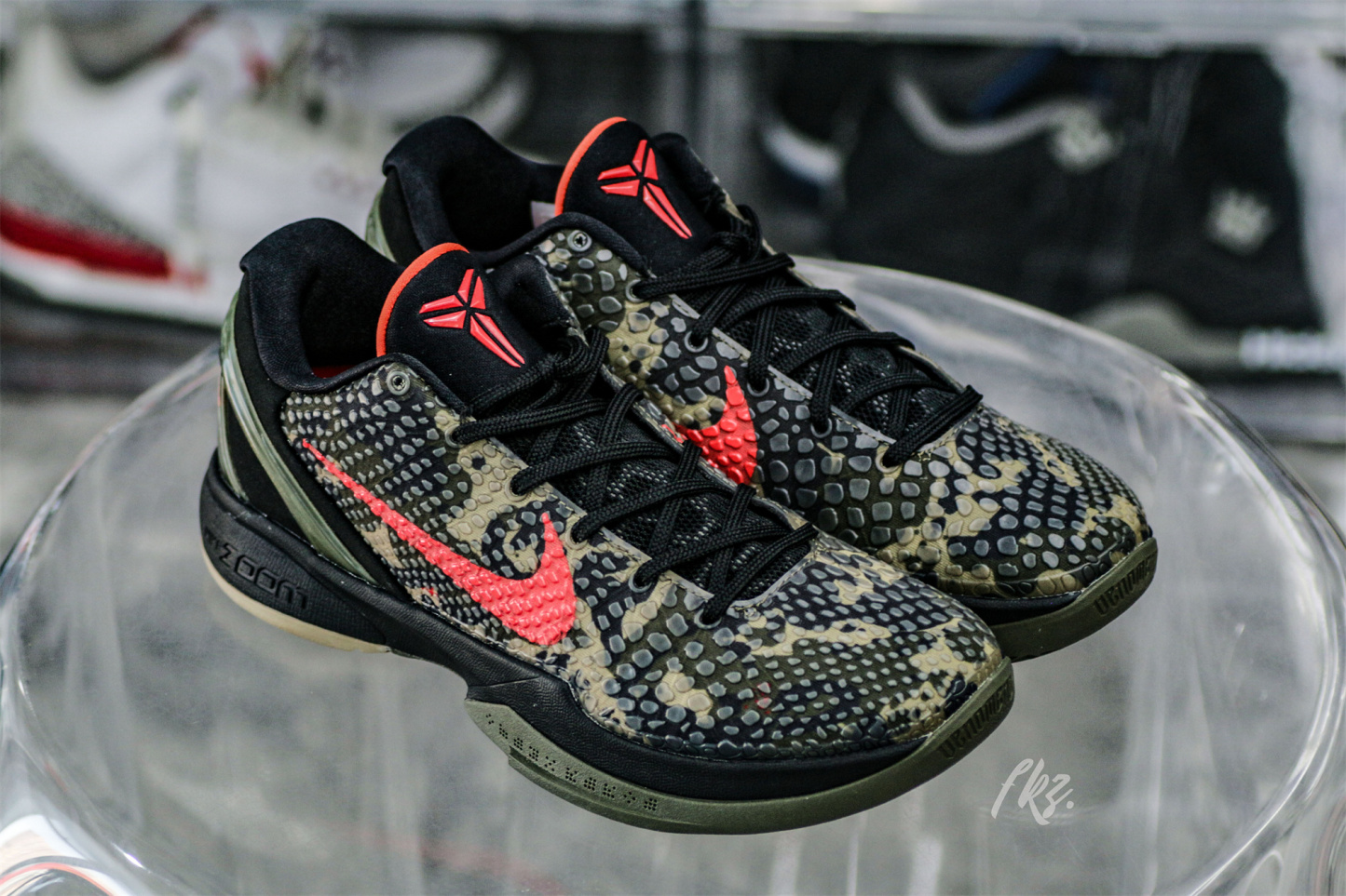 The Zoom Kobe 6 'Camo' features a utilitarian colorway that works a camo pattern into its signature polyurethane snakeskin-textured upper. The tongue and Swoosh branding add contrasting crimson, while the heel counter maintains the otherwise-subdued look. The black midsole houses Zoom Air in the forefoot and heel.
