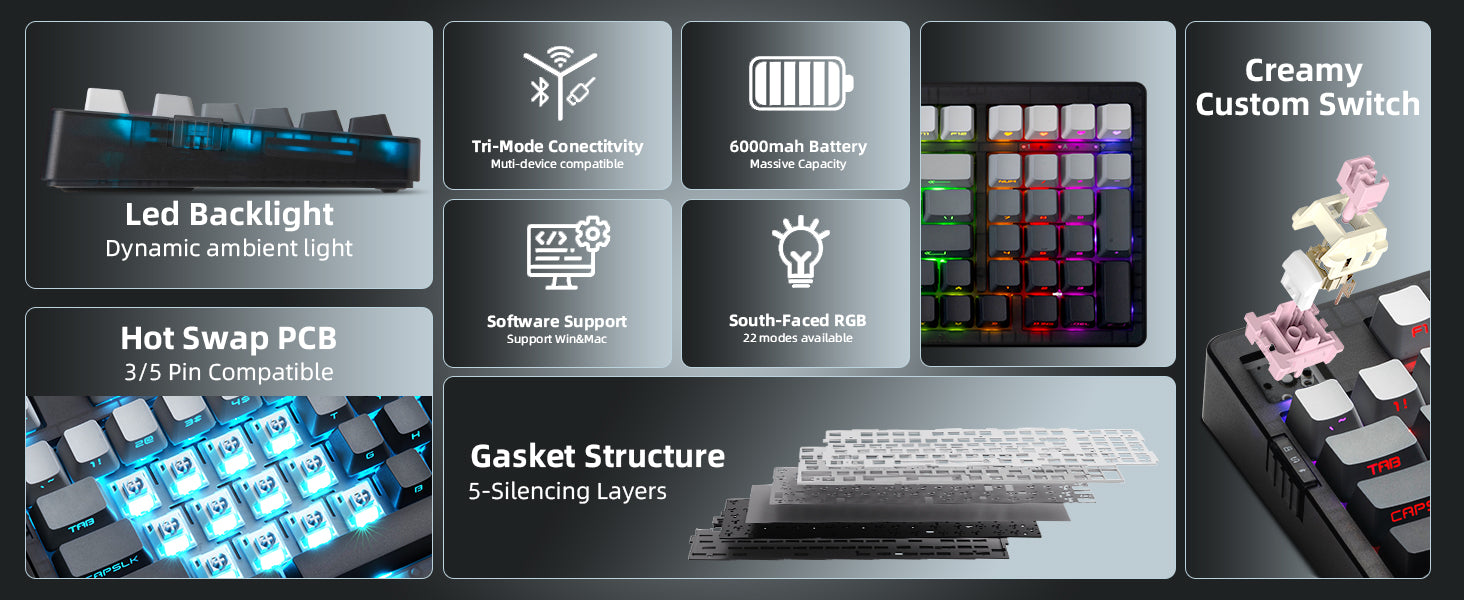 - 【Hot-Swappable & Full Customization Support】Customize your typing feel easily—no soldering needed. The PCB supports 3-pin and 5-pin mechanical switches. With driver software, remap keys, create macros, and tailor RGB effects to match your personal style.