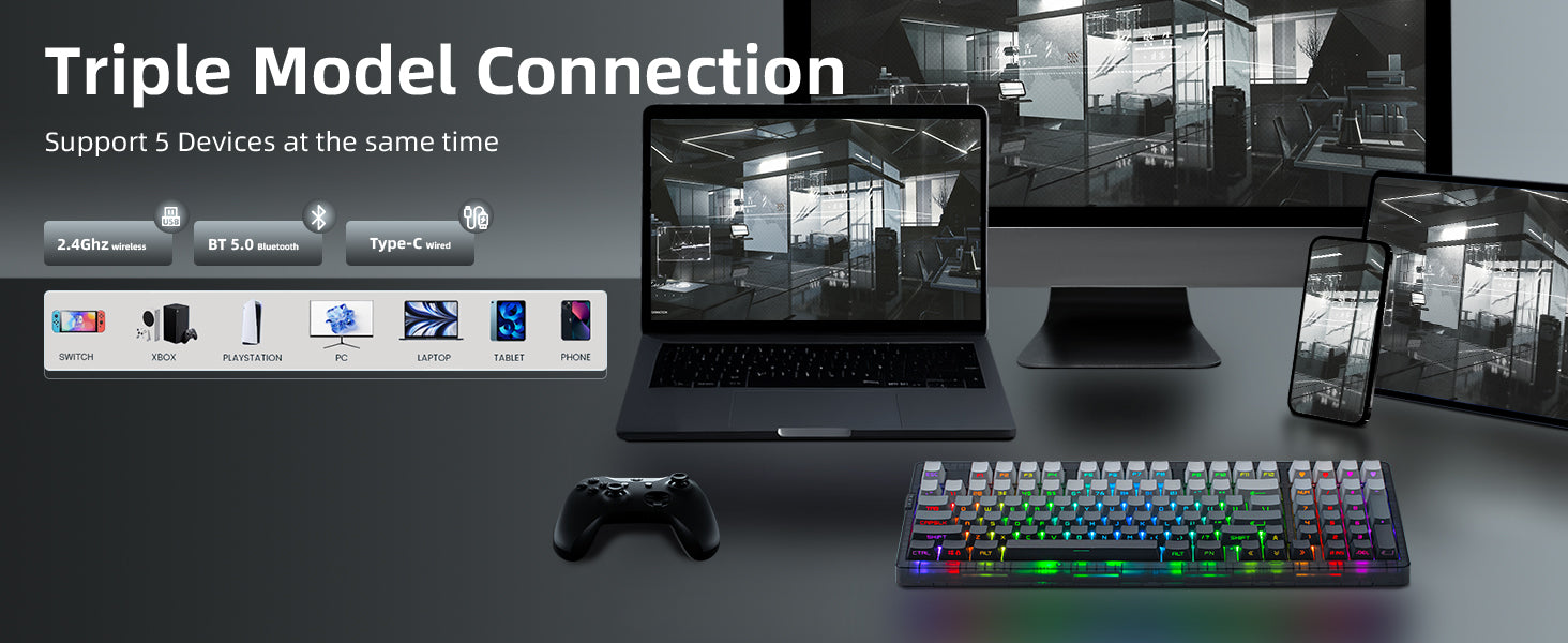 - 【Triple-Mode Connection with 6000mAh Battery】Connect via Bluetooth 5.0, 2.4GHz wireless, or USB-C. Seamlessly switch between up to 5 devices. A 6000mAh battery ensures long-lasting performance, and the included 1.8m nylon cable keeps you powered in wired mode.