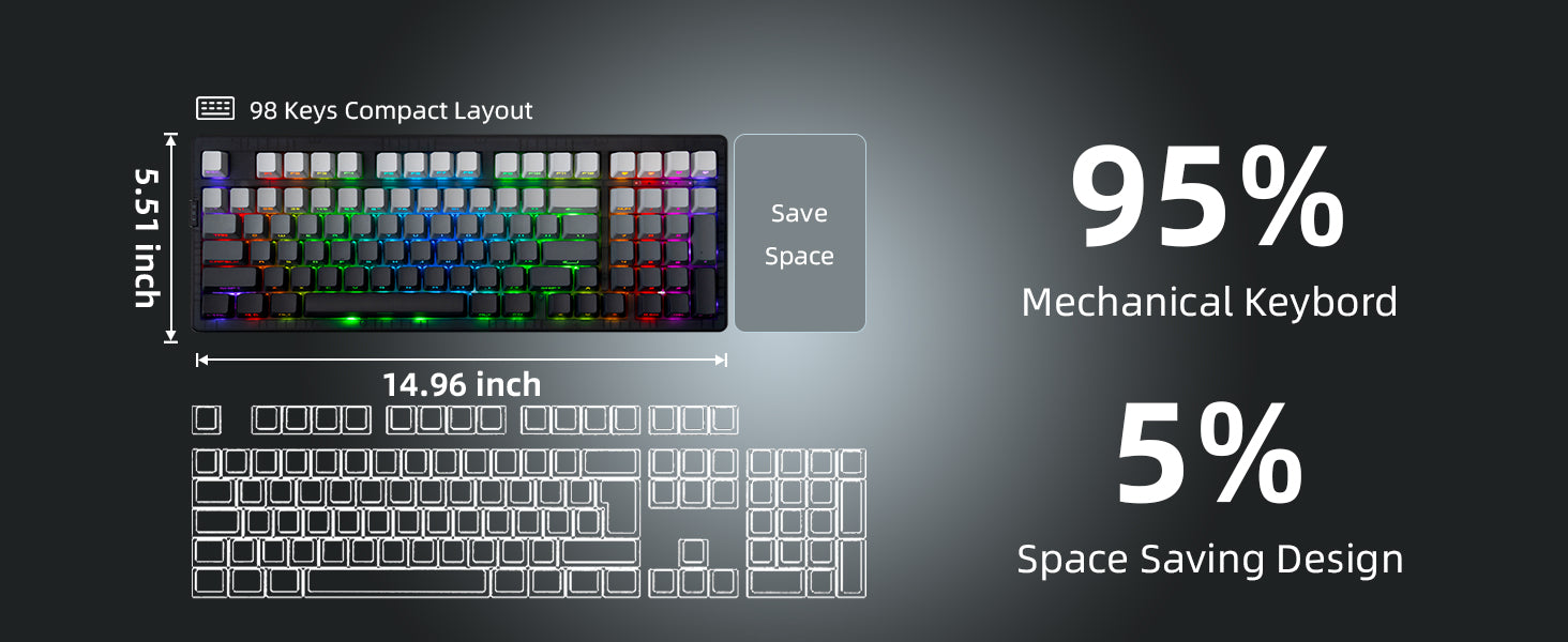 - 【95% Layout for Full Function with Compact Size】This 95% layout retains the full number pad, F-row, arrows, and navigation keys—giving you complete functionality in a space-saving footprint. Ideal for gamers, coders, and professionals who want full performance without a bulky keyboard.