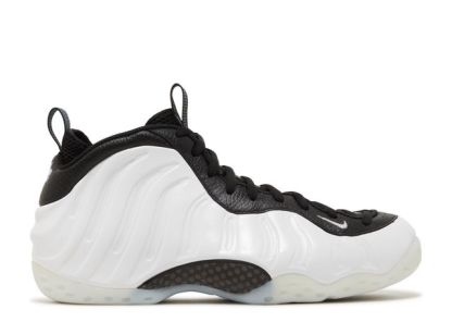 The Nike Air Foamposite One ‘Penny PE’ is a colorway originally worn by Penny Hardaway during the 1996-1997 NBA season as a player exclusive. The shoe features a white Foamposite upper with the eyestay and collar appearing in black tumbled leather. The heel tab is embroidered with Penny's 1 Cent logo, while the royal blue sockliner features Nike branding. The semi-translucent white rubber outsole provides torsional support via a visible carbon fiber shank.